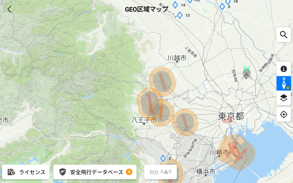 上の左側画面は、DIPSの画面で航路の進入経路に掛っているようです。右側は、DJIのGEO画面ですが、空港近辺は飛行警告を示しているようです。長細い薄赤の長方形の部分は、離着陸の経路に当たり飛行禁止のようです。